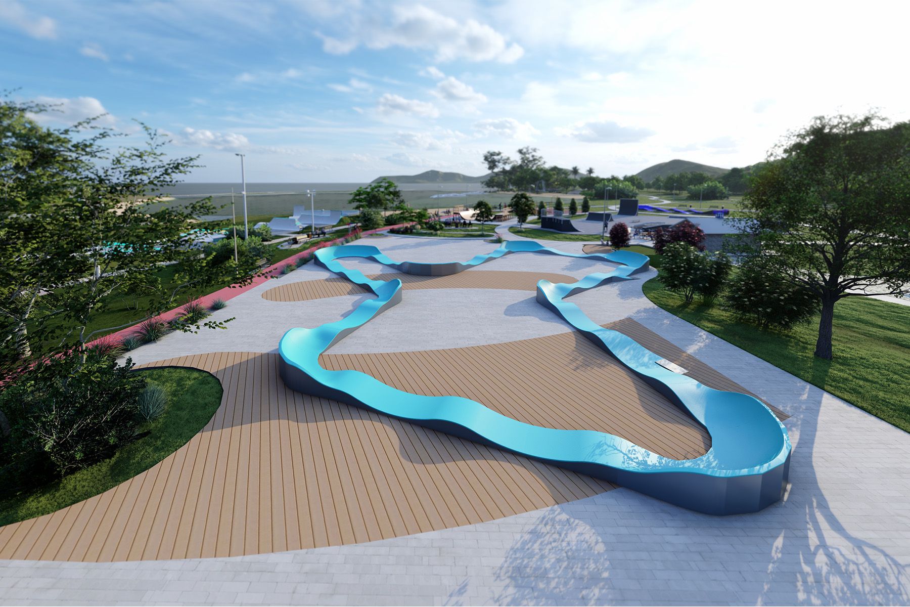 Die 108,3 m lange Pumptrack BAY TF017 ist eine modulare Radrennbahn für Fahrräder, Skateboards, Inline-Skates und Roller. Das Layout der Bahn basiert auf einer rhythmischen Abfolge von Buckelpisten und Kurven, die es ermöglichen, die Geschwindigkeit durch entsprechende Körperarbeit zu halten, ohne in die Pedale treten oder abstoßen zu müssen. Dank ihrer klaren Geometrie ist die Bahn intuitiv zu bedienen und eignet sich sowohl für Anfänger als auch für fortgeschrittene Benutzer.