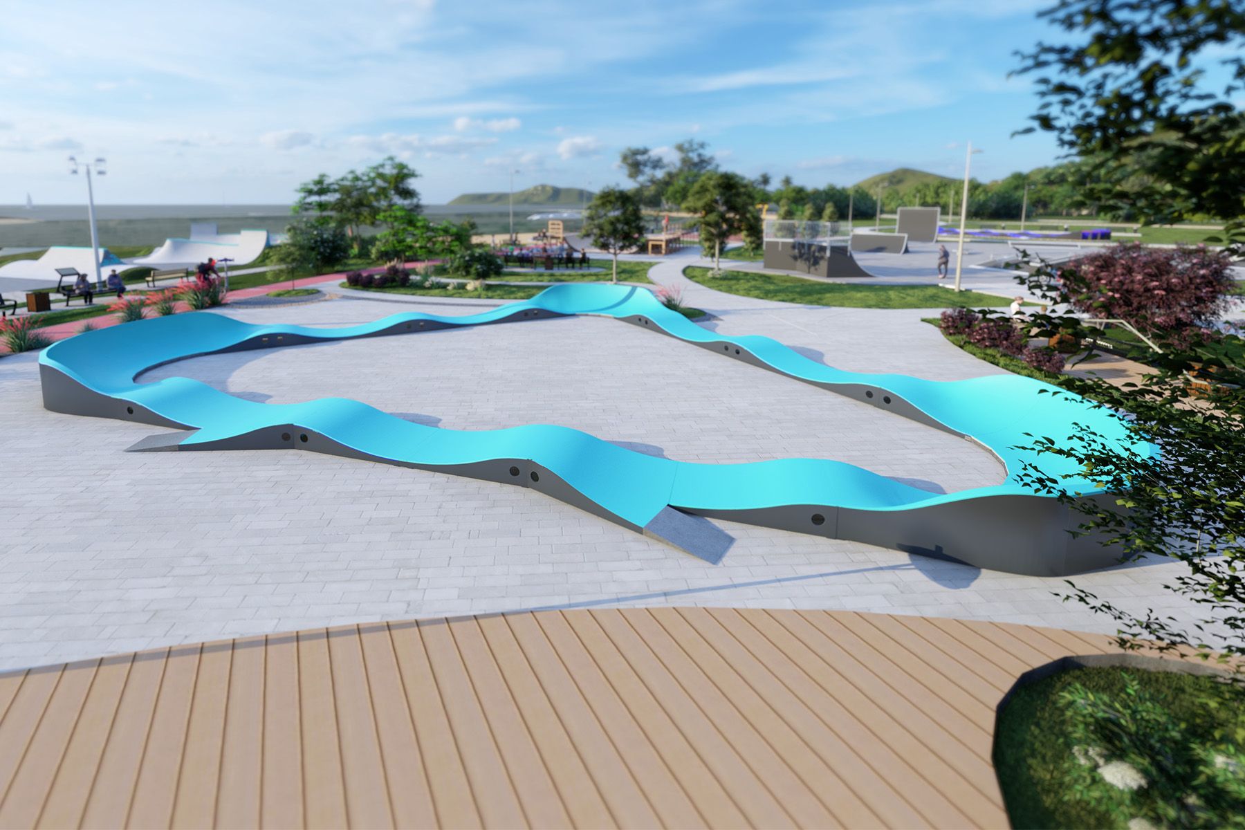 Der 54 m lange MOUNTAIN Pumptrack ist eine modulare Radrennbahn für Fahrräder, Skateboards, Inline-Skates und Roller. Das Layout der Bahn basiert auf einer rhythmischen Abfolge von Buckelpisten und Kurven, die es ermöglichen, die Geschwindigkeit durch die richtige Körperarbeit aufrechtzuerhalten, ohne in die Pedale treten oder abstoßen zu müssen. Dank ihrer klaren Geometrie ist die Bahn intuitiv zu bedienen und eignet sich sowohl für Anfänger als auch für fortgeschrittene Benutzer.
