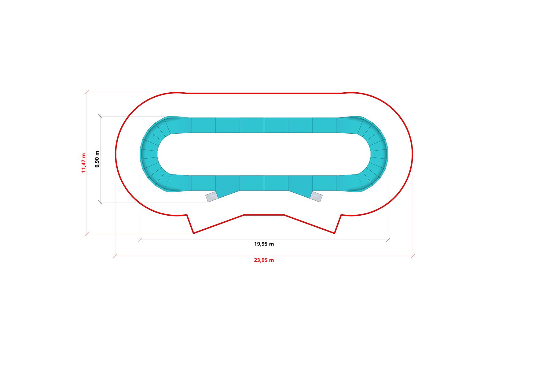 Die 40 m lange CANYON TF002 Pumptrack ist eine modulare Radrennbahn, die für Fahrräder, Skateboards, Inline-Skates und Scooter konzipiert wurde. Das Layout der Bahn basiert auf einer rhythmischen Abfolge von Buckelpisten und Kurven, die es ermöglichen, die Geschwindigkeit durch die richtige Körperarbeit aufrechtzuerhalten, ohne in die Pedale treten oder abstoßen zu müssen. Dank ihrer klaren Geometrie ist die Bahn intuitiv zu bedienen und eignet sich sowohl für Anfänger als auch für fortgeschrittene Benutzer.