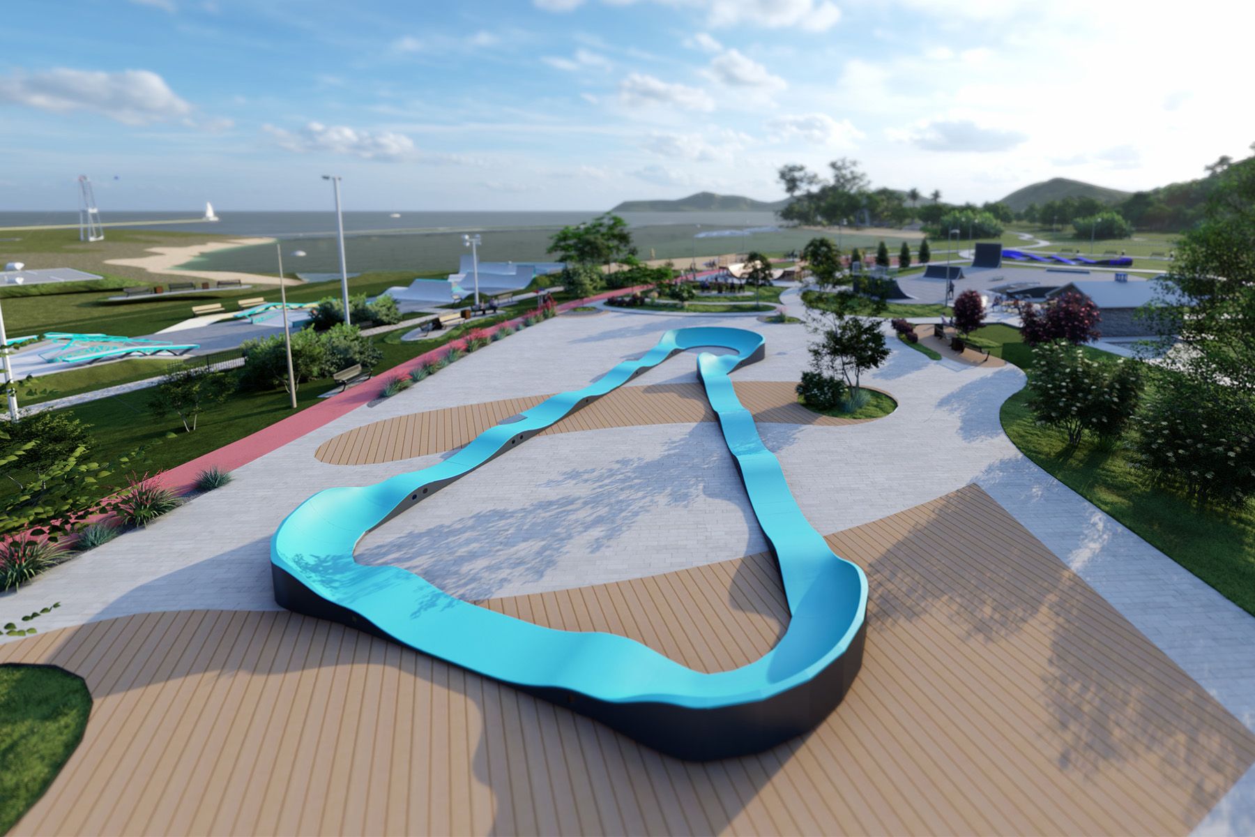 Die 67 m lange Pumptrack RIVER TF009 ist eine modulare Radrennbahn, die für Fahrräder, Skateboards, Inline-Skates und Scooter konzipiert wurde. Das Layout der Bahn basiert auf einer rhythmischen Abfolge von Buckelpisten und Kurven, die es ermöglichen, die Geschwindigkeit durch die richtige Körperarbeit aufrechtzuerhalten, ohne in die Pedale treten oder abstoßen zu müssen. Dank ihrer klaren Geometrie ist die Bahn intuitiv zu bedienen und eignet sich sowohl für Anfänger als auch für fortgeschrittene Benutzer.