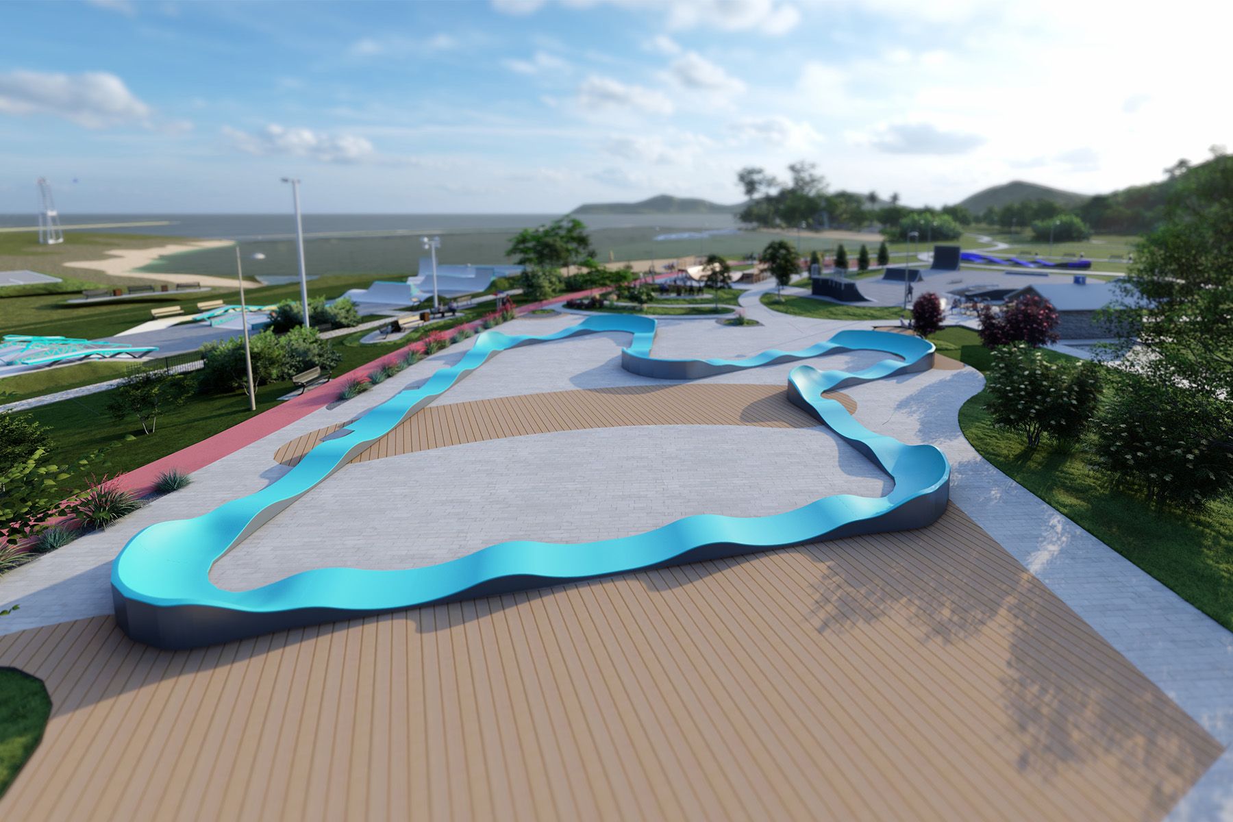 Die 103 m lange Pumptrack MESA TF016 ist eine modulare Radrennbahn für Fahrräder, Skateboards, Inline-Skates und Roller. Das Layout der Bahn basiert auf einer rhythmischen Abfolge von Buckelpisten und Kurven, die es ermöglichen, die Geschwindigkeit durch die richtige Körperarbeit zu halten, ohne in die Pedale treten oder abstoßen zu müssen. Dank ihrer klaren Geometrie ist die Bahn intuitiv zu bedienen und eignet sich sowohl für Anfänger als auch für fortgeschrittene Benutzer.