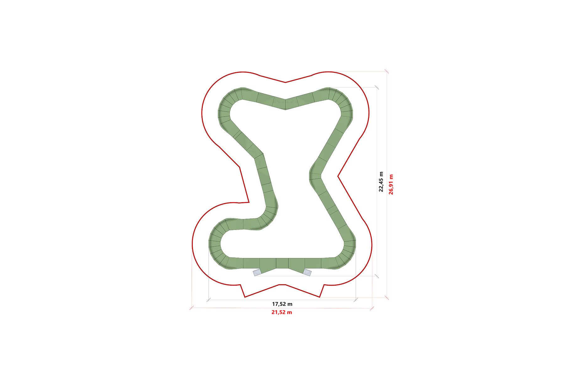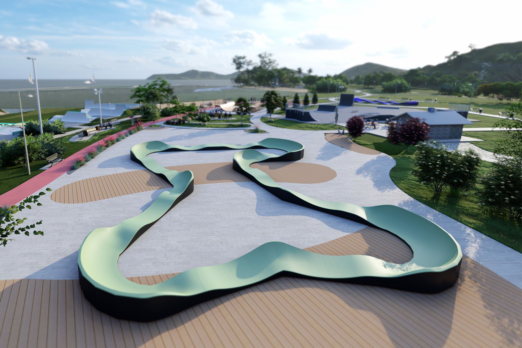 Der 86,3 m lange REUS TF026 Flow Series Pumptrack ist eine Bahn, die für eine dynamischere und sanftere Fahrt konzipiert wurde. Die ausgeprägte Anordnung von Kurven und Wellen schafft eine Fahrlinie, die den Benutzer nicht nur in eine Auf- und Abwärtsbewegung, sondern auch in eine Rechts-Links-Bewegung versetzt, wodurch die Fahrt rhythmischer und intuitiver wird. Diese Geometrie ermöglicht es dem Fahrer, die Geschwindigkeit beizubehalten, ohne in die Pedale treten zu müssen, und bietet gleichzeitig mehrere Möglichkeiten, die Fahrlinie zu wählen.