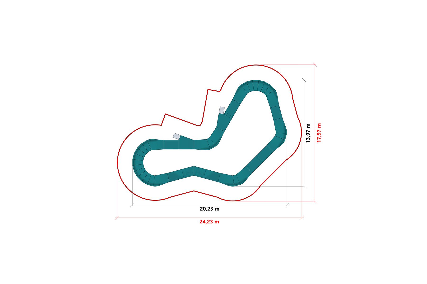 Die 57,6 Meter lange YUKON TF022 Pumptrack ist eine modulare Bahn, die für das Fahren mit Fahrrädern, Skateboards, Rollerblades und Scootern konzipiert wurde. Die Geometrie der Bahn bietet Anfängern und erfahrenen Nutzern gleichermaßen eine sanfte, intuitive Fahrt, wodurch sich die Anlage als Freizeitraum für Kinder, Jugendliche und Erwachsene eignet.